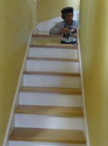 玄関を開けると階段の姿が!!思った以上に工事が進んでいました。しばし、出遅れました(>_<)
